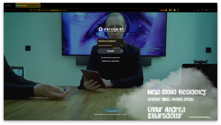 Servus's self-hosted cloud login page became a space for artistic experimentation within the project Next Cloud Residency in 2021. In this image Unnur Andrea Einarsdóttir (Right)
