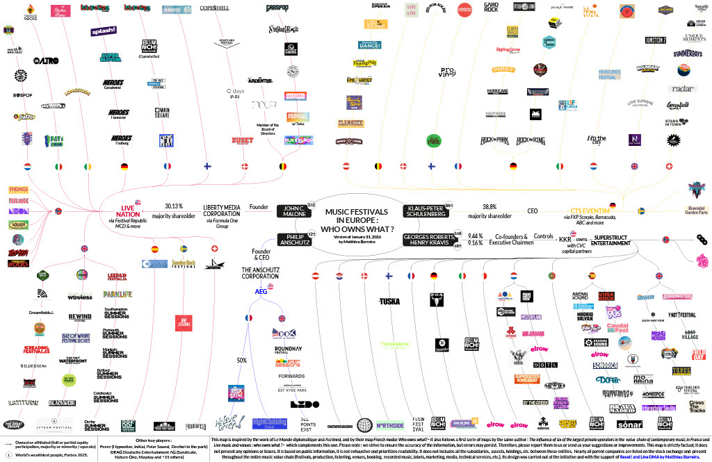 The two ownership maps do not claim to be exhaustive, but they make visible a reality that has long been overlooked. They invite institutions, professionals, and citizens to ask a simple question: when we buy a ticket for a festival or a concert, who do we really support, and what kind of ecosystem do we want for live music in Europe?