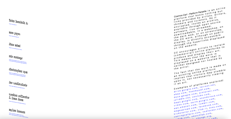 Cosmos Carl described its approach as a form of platform parasitism. While the term “parasite” often carries negative connotations, its meaning shifts in this context. The project operated alongside major platforms, including Google Drive, Meta-owned services, and LiveLeaks, redirecting users through third-party links that obscured conventional data tracking. In doing so, Cosmos Carl repurposed the power and data hunger of large-scale platforms to serve artistic and critical ends.